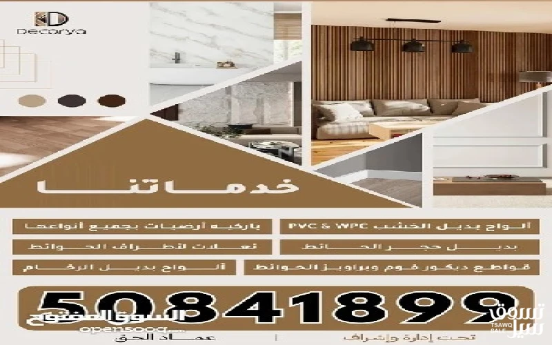 الوصف نقدم لك جميع احتياجاتك لأعمال الديكور، من باركيه وأرضيات بمختلف أنواعها، بديل الخشب والرخام والحجر، براويز حائط، قواطع خشبيه