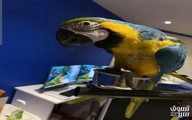 لون أزرق في الظهر والأجنحة لون أصفر (ذهبي) في الصدر والبطن وجه أبيض مع خطوط سوداء عمره 3 سنين يتكلم معا كامل المرفقات الصامل يبشر بالخير