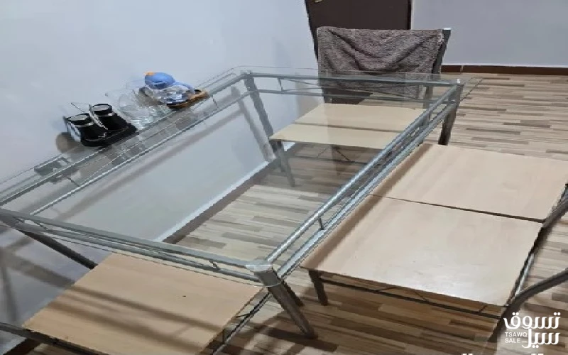 Glass top dining table with 4 chairs in good condition, good for small family. Dimension 110 x 70