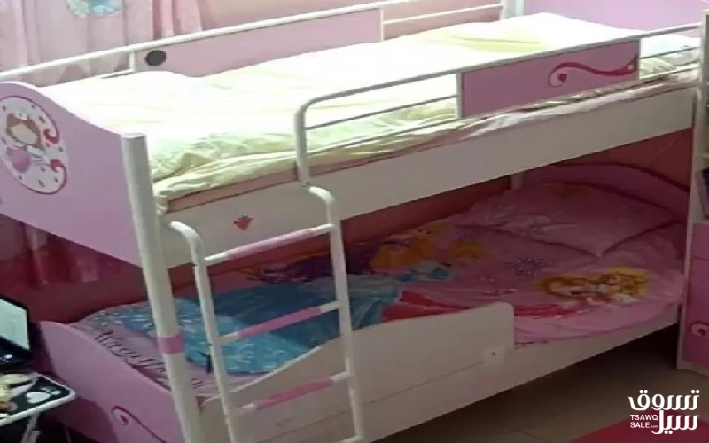 غرفة نوم بناتي يحتوي على سرير بانك (دورين) بدون مراتب ولا كبت فقط مع تسريحة ومكتبة، بحالة جيدة جدا. السعر قابل للتفاوض.