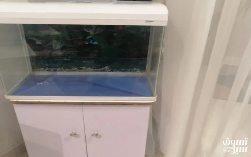 حوض سمك شبه جديد مع الاستاند لتخزين كافة اغراضه اللون ابيض ....وكل مستلزماته معه ( مضخة هواء وفلتر وسخان واضاءة ) للتواصل عبر السوق المفتوح او واتساب