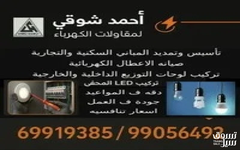 كهربائي محترف تأسيس وتمديد وصيانة الاعطال الكهربائية وبأسعار تنافسية وبجودة عالية تركيب الثريات والمخفي بروفيل LED تركيب الاسبوت لايت تركيب جميع انواع الانارة الداخلية والخارجية انارة الحدائق والبركن تركيب وتغير بلاكات سوتشات نعمل ف جميع أنحاء الكويت