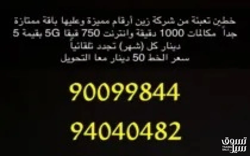 خطين تعبئة من شركة زين أرقام مميزة وعليها باقة ممتازة جداً مكالمات 1000 دقيقة وانترنت 750 قيقا 5G بقيمة 5 دينار كل (شهر) تجدد تلقائياً سعر الخط 50 دينار معا التحويل إضغط ليظهر الرقم.. 900998XX إضغط ليظهر الرقم.. 940404XX