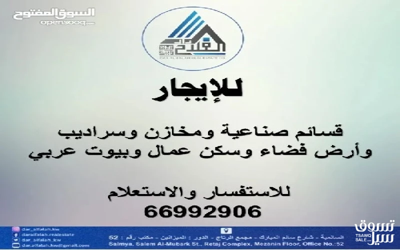 لايجار قسائم صناعية ومخاذن وسراديب وأرض فضاء وسكن عمال للشركة والمؤسسات ولافراد مساحات متنوعة