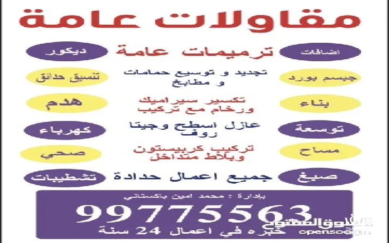 توسيعات تكسير سيراميك ورخام مع تركيب مساح سيجما عوازل جيتاروف صبغ داخلي وخارجي جميع أعمال الكهرباء جميع أعمال الصحي جميع أعمال الحداده تنسيق حدائق بحيرات