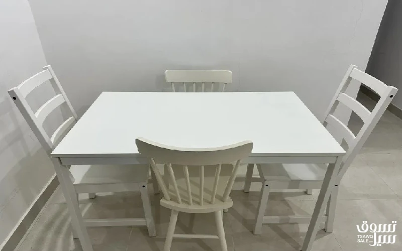 سفرة من ايكيا لون ابيض بحالة ممتازة جدا مقاس 120*75 ارتفاع 75 مكونة من طاولة و اربع كراسي للتواصل 65190403