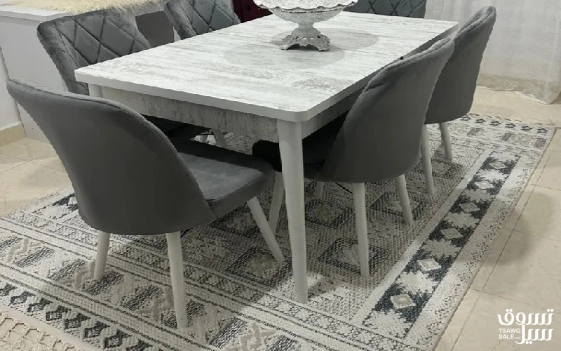 طاولة سفرة للبيع في أبو حليفة قابلة للفتح استعمال خفيف جدا شبه الجديدة 6 كراسي لون ابيض وكراسي رمادي مخمل