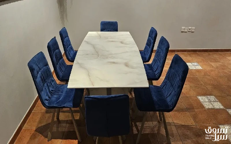 طاولة طعام رخام 8 اشخاص مستعمل بحالة جيدة ( فيها طقة صغيره ما تبين من بعيد موجوده بالصور ) الكراسي شمواه نظيفه سعر اليديده مع الكراسي يطوف ال 300 الصامل ما راح اقصر معاه