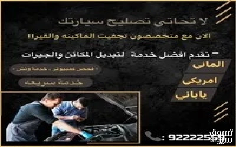 الوصف تجفيت ماكينه - جير - كهرباء خدمه سريعه - فحص كمبيوتر - فحص سياره امام المنزل - خدمه ونش - آسعار مناسبه الماني - أمريكي - ياباني هاتف :اضغط لإظهار رقم الهاتف 965922225XX