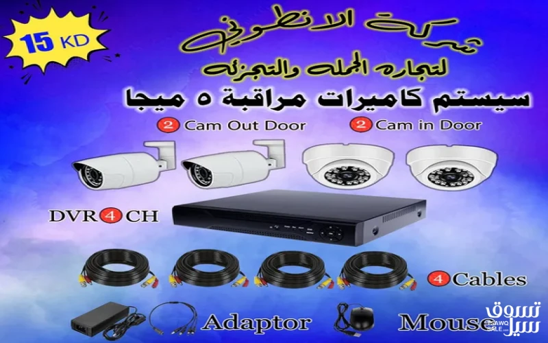 طقم كاميرات 5 ميجا مع الدي في آر مع الكابلات مع الباور مع الماوس ( يعني من المحل علي التركيب ) عدد 4 كاميرات 2 داخلي و2 خارجي مع الجهاز وأغراض التركيب