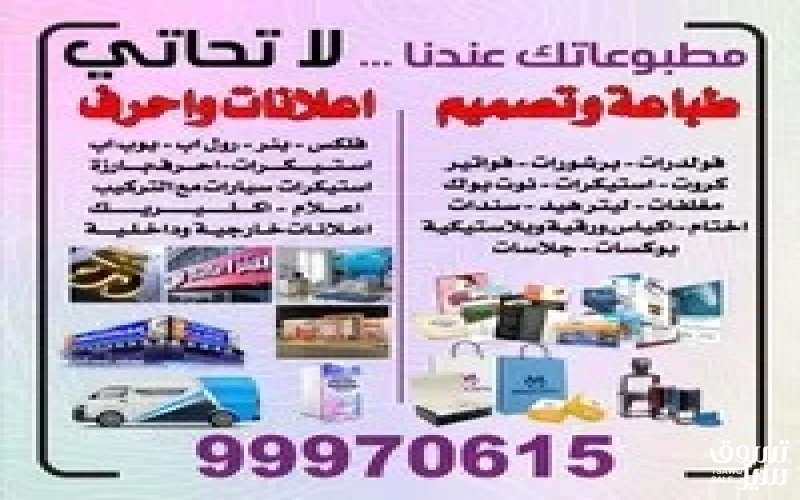 ورق ليتر هد (مرسالات). اظرف بجميع مقاستها. بزنزكارت. منيو مطاعم. بروشوار. فواتير. سندات وصرف. فواتير كمبيوتر. فلاير. فلدر. ملفات. كتب. تجليد فني. بوكسات. علب. اكياس ورقيه. رول اب. بنر. استيكر. استيكر سيارت. لوحات اعلانيه. فيلكس. تصاميم. بوستات. اداره انستجرام. طباعه علي جميع الهدايا ماجات. اقلام. كابات.تيشرتات. دروع. اختام