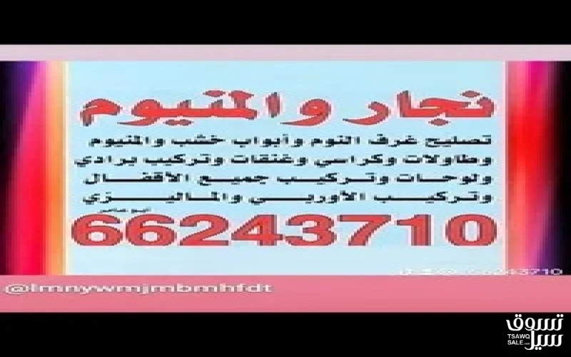 الوصف تصليح ابواب ودرايش ومطابخ وطاولات وكراسي وسراير وغنفات تصليح جميع غرف نوم وفك وتركيب وصيانة اروبي وصني واكيا وأبيات تركيب ارفف ودفشات ولوحات وستاير وزجاج ومريا وتركيب علاقات ملابس أصليه تركيب علاقات حمام مطابخ وفتح اقفال