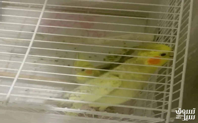 زوج طيور كوكتيل كروان مع القفص للبيع الاستلام من حولي التواصل عالبرنامج